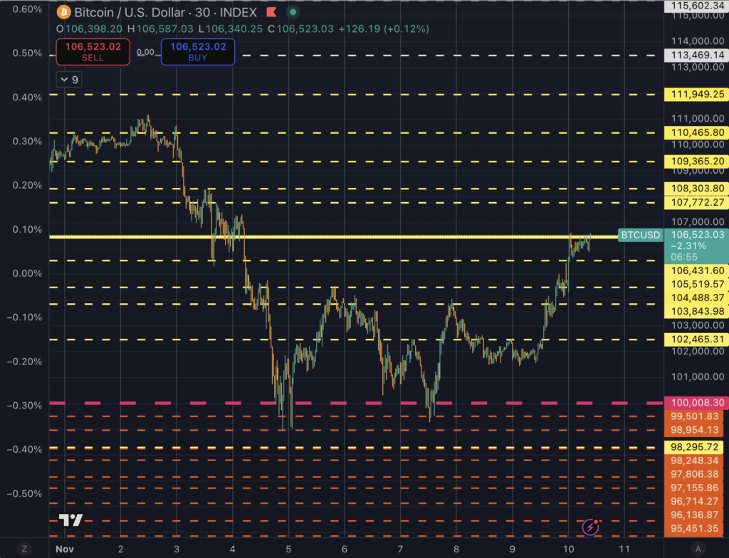 Bitcoin is back at $106,400, a pivot point that has been critical to this cycle’s rallies and pullbacks.
