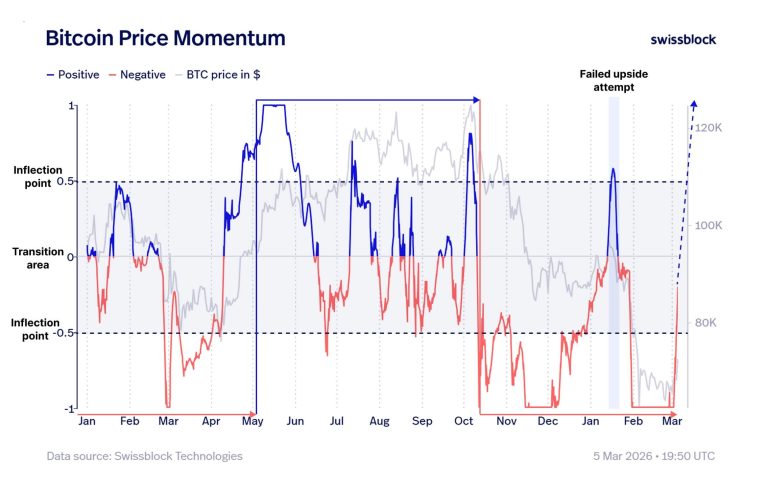 For context, Swissblock’s momentum framework showed that Bitcoin was climbing out of a deeply negative zone that has tended to appear near major transitions.