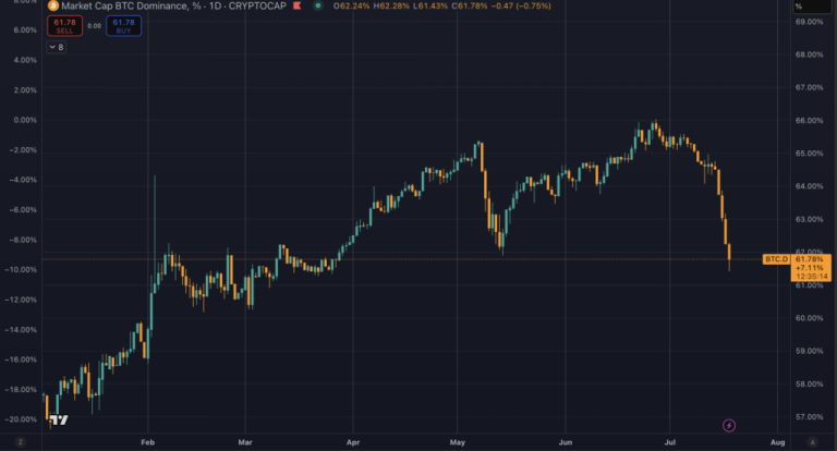 Bitcoin’s share of the total crypto market fell below its key ascending channel for the first time in 2025, closing at 61.6% on July 18. After peaking at 66% in June, the move is a symbolic shift, historically seen as a green light for altcoin outperformance.