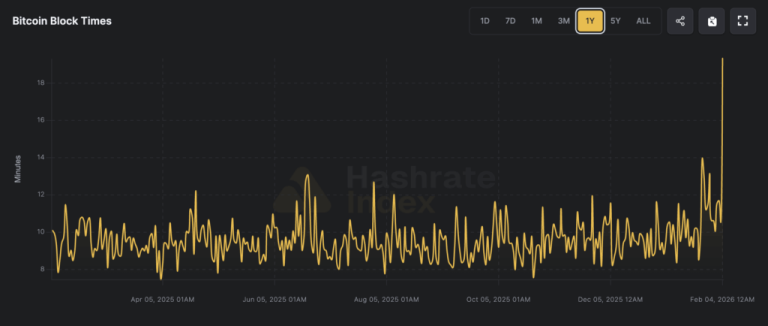 Bitcoin block times over the past year remain mostly stable near the 10-minute target, but a sharp spike in early February 2026 highlights the recent slowdown tied to miners curtailing hashpower.