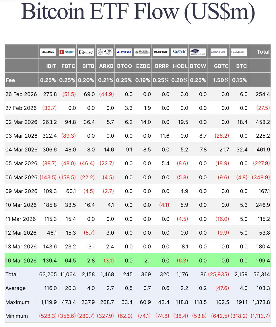 The best proof for this lies in ETFs. Farside data shows that spot Bitcoin ETFs saw $199.4 million in inflows on March 16, marking the sixth consecutive day of inflows after two days of heavy redemptions.