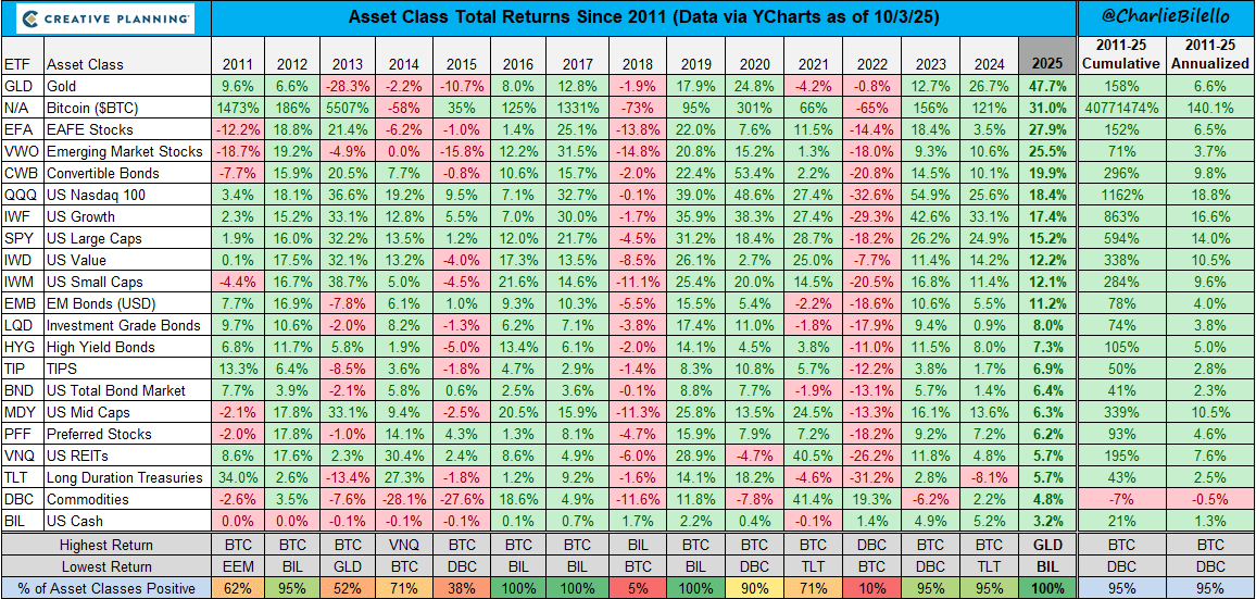 Gold has surged 48% year to date, reaching an all-time high near $4000. In comparison, Bitcoin has gained over 30% this year and has reached a new high above $126,000. Notably, this marks the first time the two assets have simultaneously held the top performance spots in any calendar year.