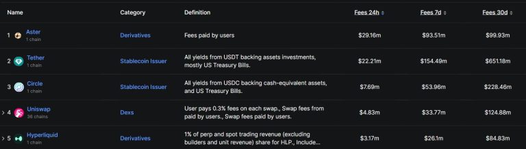 According to DeFiLlama data, Aster ranked as the highest revenue-generating protocol in the past 24 hours, surpassing Tether and Circle, the two leading stablecoin issuers.