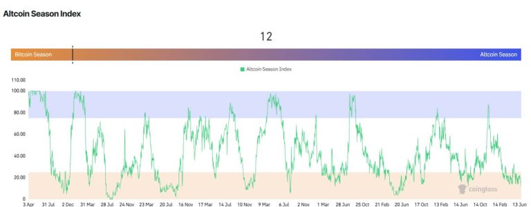 Data from CoinGlass shows the Altcoin Season Index has plunged to 12, its weakest level in nearly a year, reflecting a deepening lack of interest in non-Bitcoin cryptocurrencies.