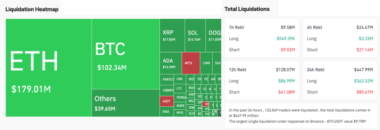 The crypto market saw heavy liquidations totaling $449.11 million, with the overwhelming majority coming from longs. Out of this figure, $362.34 million came from longs and just $87 million from shorts, showing that most traders were positioned for the upside.