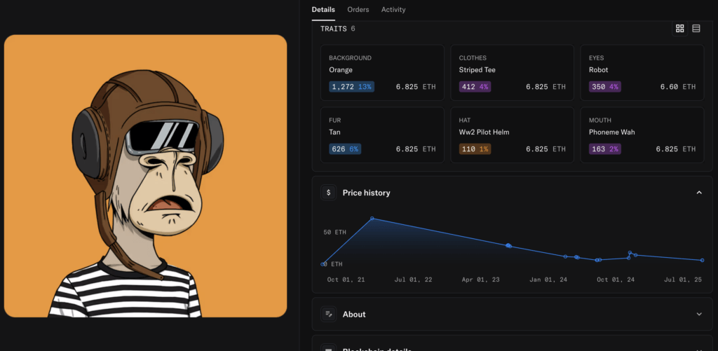 The Blue Chip flagship NFT, Bored Ape Yacht Club remains in a perilous state for those who invested six figures into AWS hosted jpegs. The NFT below sold for over 74 ETH in 2021 but is now worth just 9 ETH, an 87 percent decline in three years.