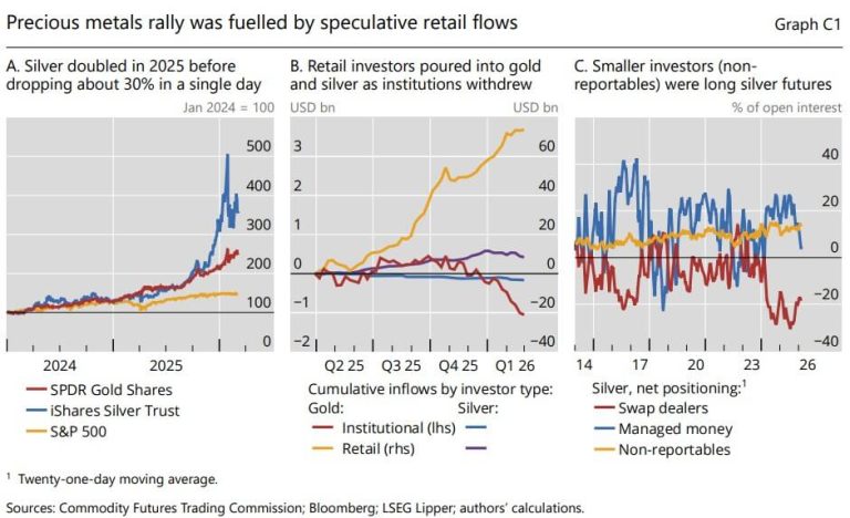 The BIS tied the move to a broader run-up that stretched through 2025 and into early 2026. Gold and silver rose sharply before reversing in late January and February, a swing the BIS said was amplified by retail participation through ETFs, daily rebalancing by leveraged products, and margin-driven selling.